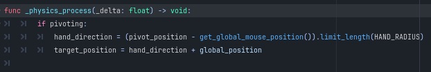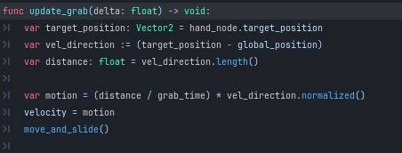 "Every physics frame, when the player is grabbing onto an environment object (when the "pivoting" flag in the Hand script is set to true), it calculates the target position of the player. Then, in the player script, a speed is given based on how close they are to the target position. This gives an interpolated velocity effect."